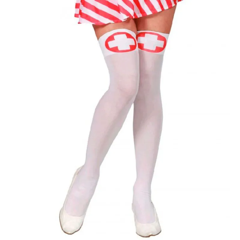 ¡Completa tu disfraz de enfermera! Medias de color blanco con una cruz en fondo rojo en la parte superior. Talla única. NO incluye falda y calzado.