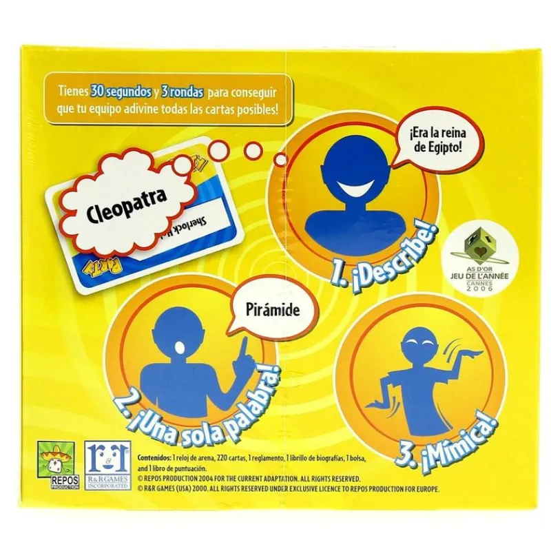 218 cartas con 436 personajes diferentes, una libreta de resultados, un reloj de arena, un libreto explicativo de los personajes y una bolsa para que puedas llevarte el juego contigo donde quieras.