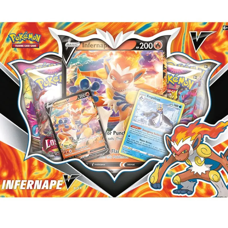 Caja Pokémon TCG Infernape en la que encontrarás una carta holográfica de promoción de Infernape V, una carta holográfica de Empoleon, una carta holográfica de gran tamaño de Infernape V, 4 paquetes de mejora de TCG Pokémon y una carta de código para TCG Pokémon Live.