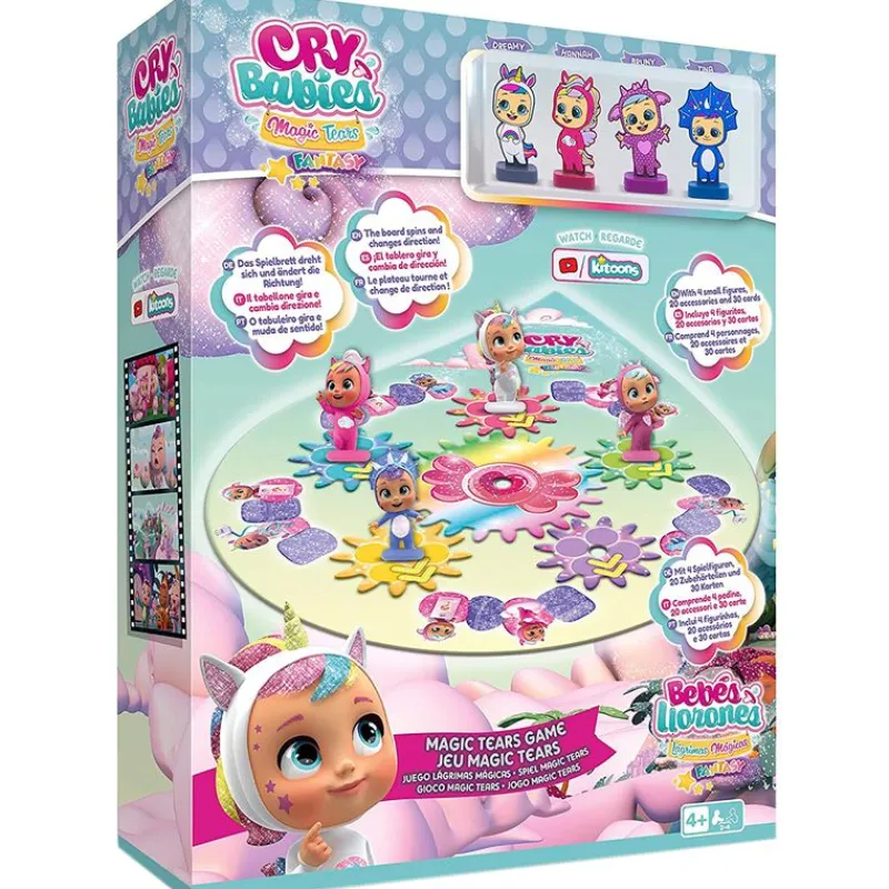 Juego de mesa inspirado en la serie de animación Bebés Llorones Lágrimas Mágicas. Lanza el dado y avanza por el tablero, deberás conseguir tus 4 accesorios antes que tu rival. El tablero gira y cambia de dirección. En el interior encontrarás un tablero, 4 figuras inspiradas en tus personajes favoritos, 20 cartas de acción, 10 cartas de accesorios y 20 accesorios de cartón. De 2 a 4 jugadores. Recomendado a partir de 4 años.