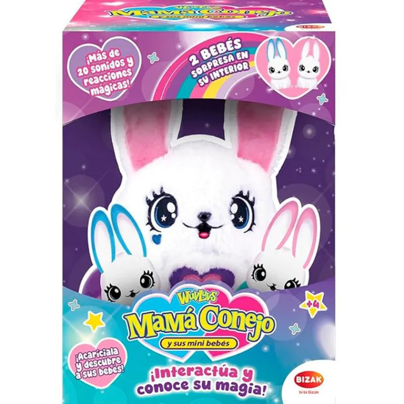 Abre su barriguita y encuentra 2 mini conejitos y una manta para cuidarlos.