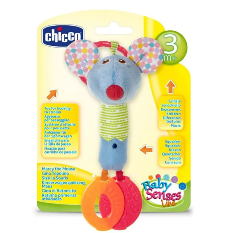 Un peluche sonajero muy suave al tacto que se puede colgar fácilmente al carrito o la cuna. Consta de partes de plástico para aliviar el periodo de dentición, y al apretar el cuerpo del ratoncito se puede escuchar sonido. Se puede lavar a máquina.