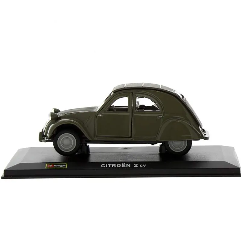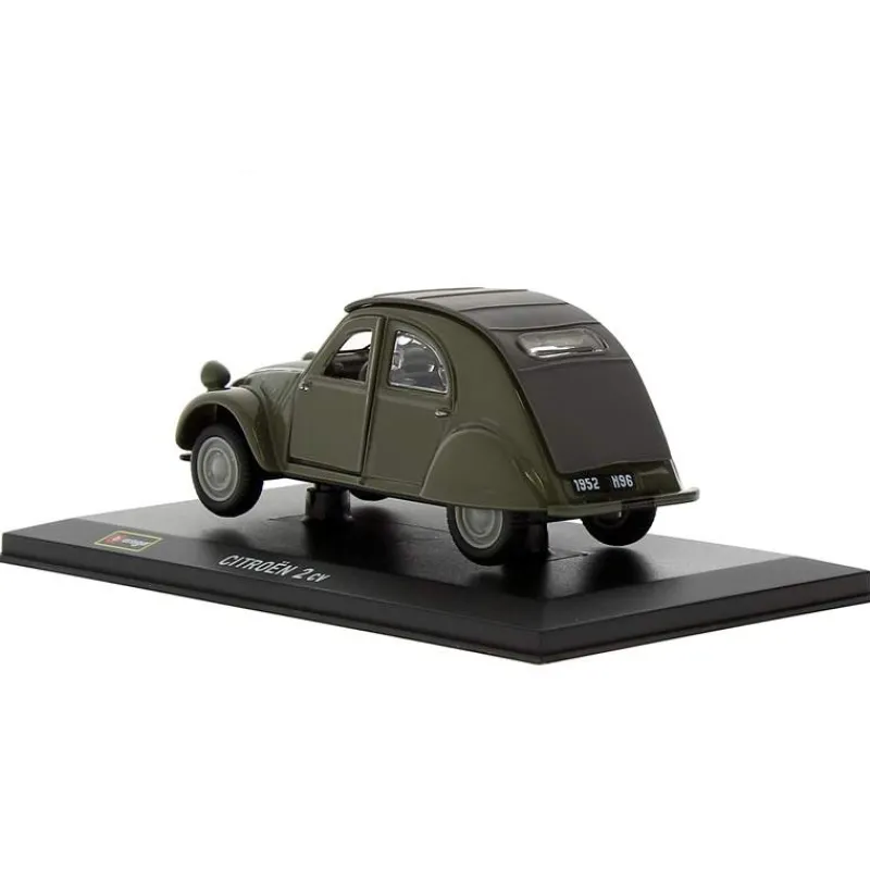 Vehículo clásico de la marca Burago con peana y caja de metacrilato a escala 1:32. Este modelo del CITROEN 2CV (1952) es una réplica exacta del original.