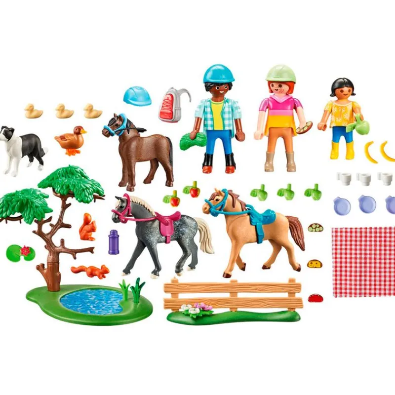 Pack de la colección Playmobil Country en el que encontrarás 3 figuras de Playmobil, 2 caballos, un poni, un perro, cascos de montar, sillas y un picnic. Recomendado a partir de 4 años.