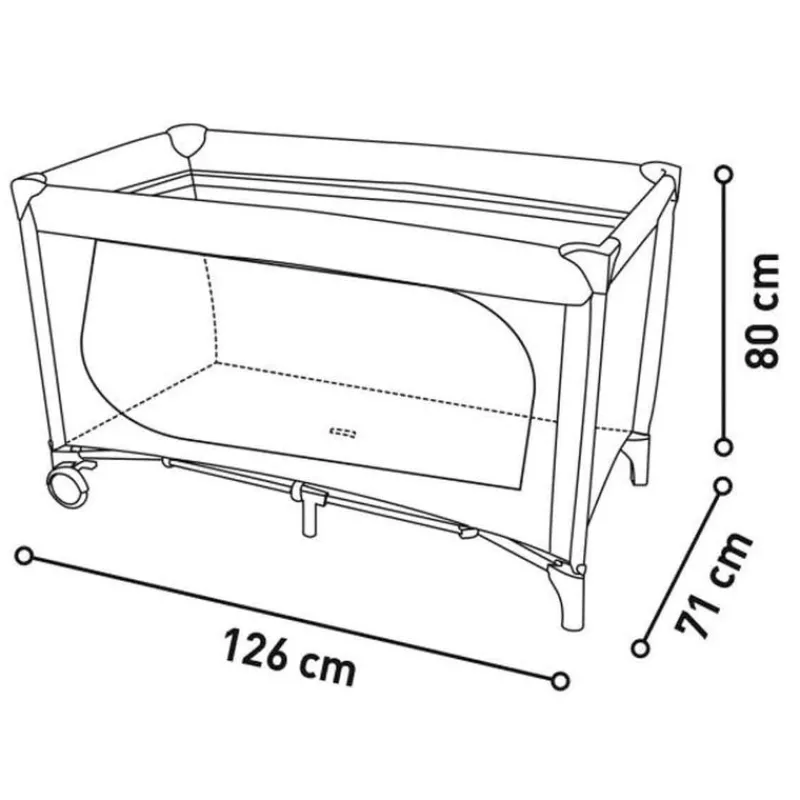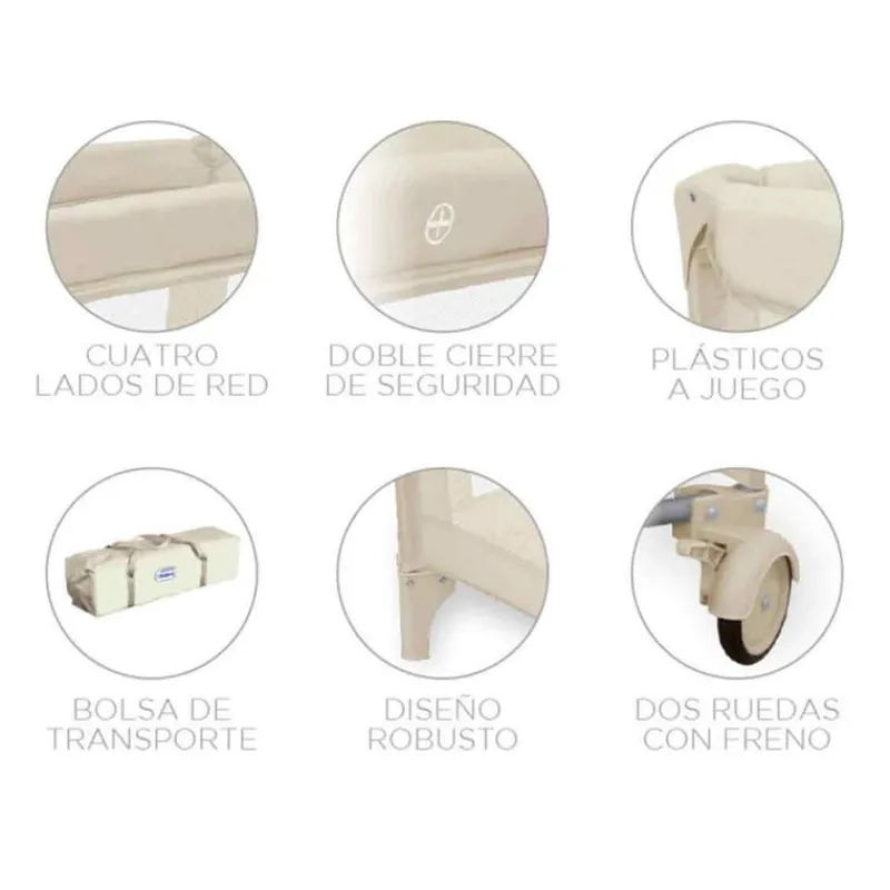 Incluye un colchoncito acolchado (somier de 2cm) y con los laterales fabricados con tejido de malla para una perfecta aireación y facilitar el contacto visual con el bebé. Con ruedas para facilitar el traslado.