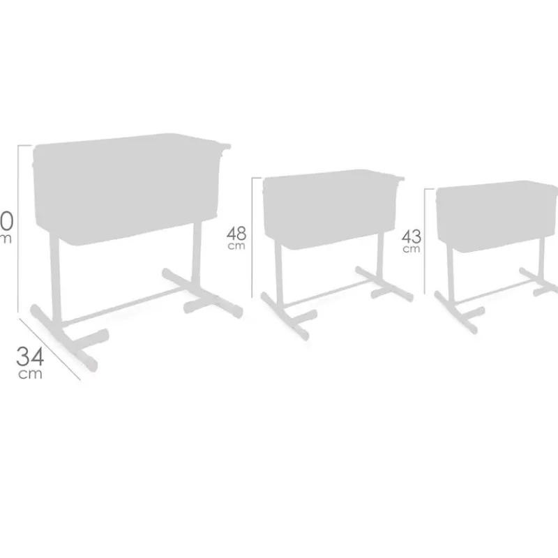 Medidas aproximadas de la cuna: 50 cm de alto (ajustable a 48 o 43 cm de alto), 34 cm de ancho y 50 cm de largo.