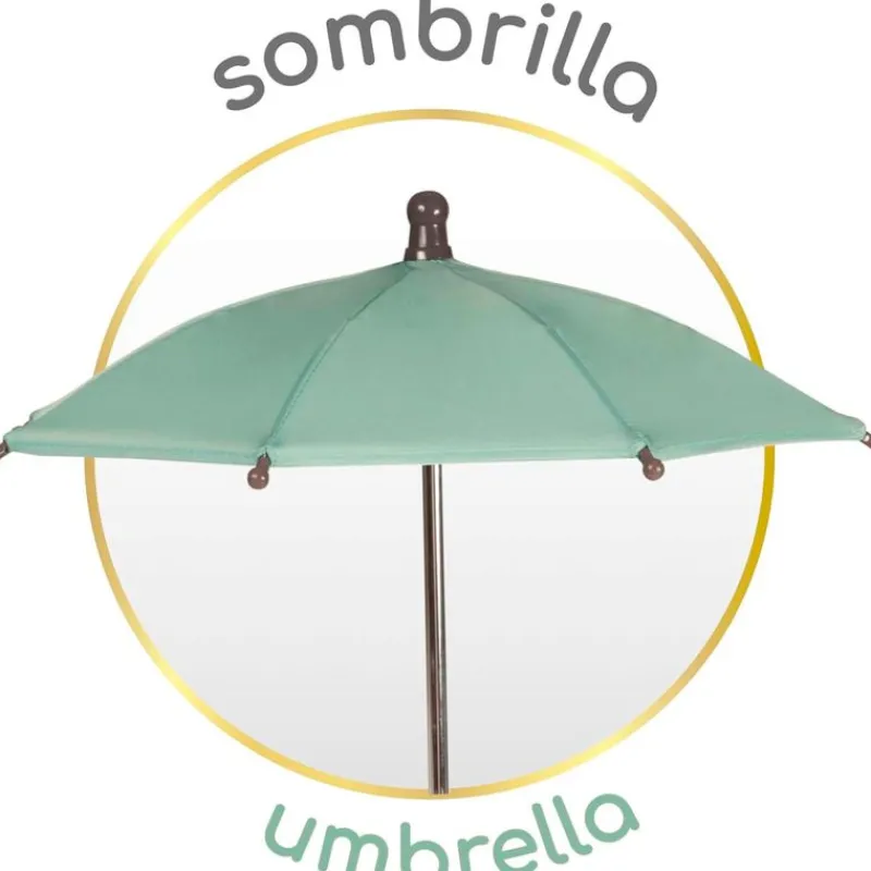 Su color es verde y negro con sombrilla, estructura plegable, bandeja portaobjetos inferior, tela acolchada y lisa combinada, tono cromado en la parte de la estructura, ruedas con cubierta de foam, bolso a juego con cremallera dorada y muchos detalles de lujo.
