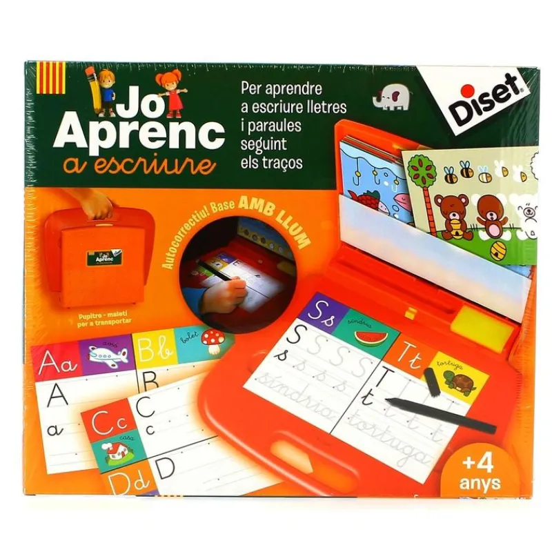 Maletín educativo para aprender a escribir tus primeras palabras con el abecedario en catalán. Incluye láminas con letras en mayúscula y minúscula. Tiene luz y una base que actúa como sistema autocorretor. Ideal para iniciarse en la lectoescritura, practicar la lectura, componer palabras sencillas, separar palabras por sílabas o aprender nuevo vocabulario.