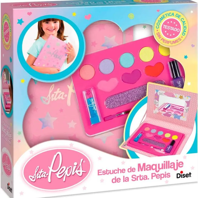 Estuche de maquillaje de la Srta. Pepis con diferentes maquillajes y un espejito con el que podrás practicar. Gracias a su tamaño podrás llevarlo contigo a todas partes. En el interior encontrarás un pintalabios, un pintauñas, 5 sombras de ojos, 3 brillos de labios, un pincel y un aplicador de sombras. La pintura de uñas se retira fácilmente. Recomendado a partir de 3 años.