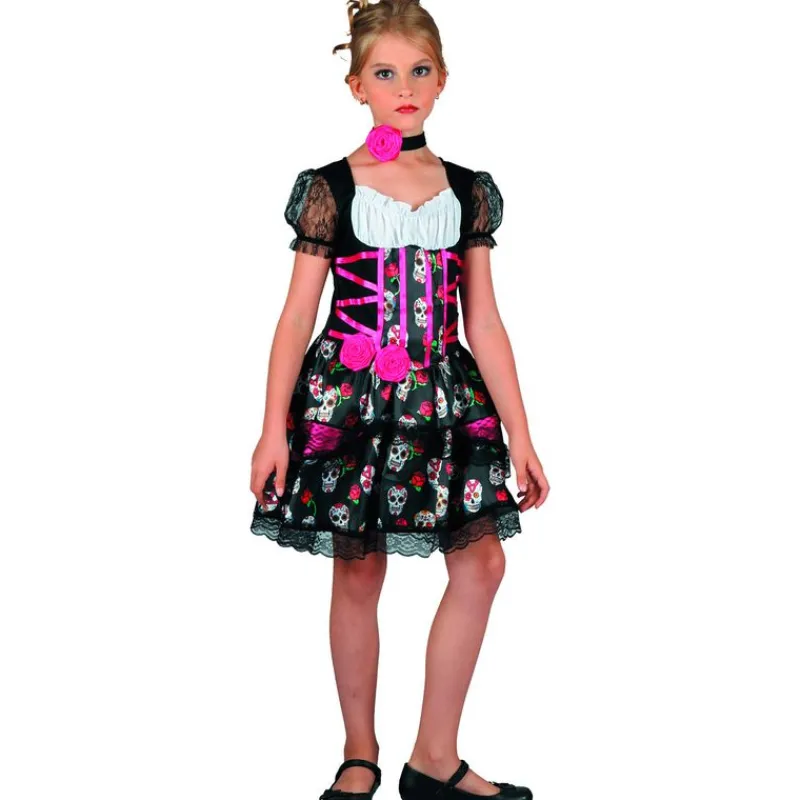 Disfraz de día de muertos compuestos por un vestido con detalles de calaveras y un choker. NO incluye calzado. Talla S (Altura 110-120cm, pecho 62cm, cintura 57cm, 4-6 años) orientación aproximada.