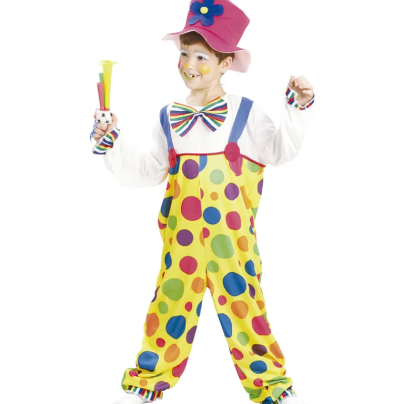 Divertido disfraz de payaso tipo mono con distintos colores, tirantes, una gran pajarita multicolor y un gorro grande decorado con una flor. NO incluye calcetines y trompeta.