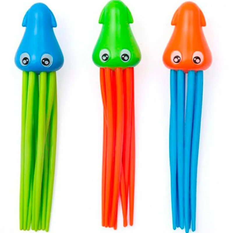 Pack de tres calamares de colores con peso, para que puedas divertirte buceando y buscándolos en el fondo de la piscina.