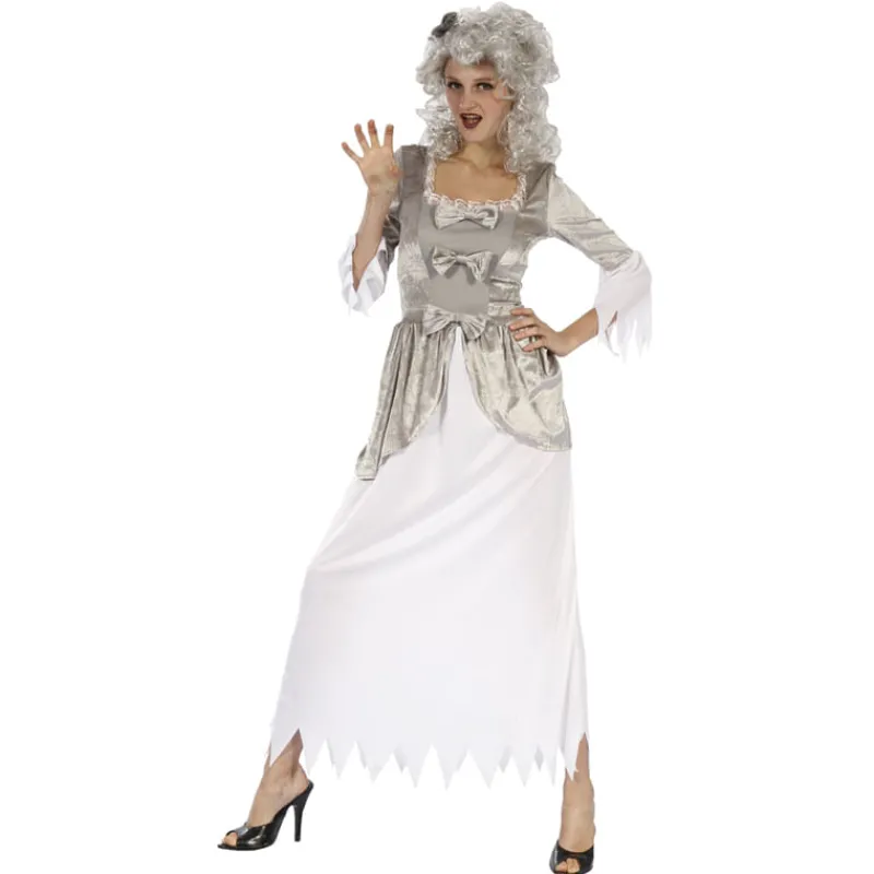 Elegante disfraz de mujer Condesa. Está compuesto por un vestido largo en colores combinados blanco/gris. Lleva lazos en la zona del pecho en color gris y volantes en el contorno del cuello. NO incluye peluca ni calzado.Talla M (Talla 42) Altura 170cm, pecho 102cm, cintura 86cm, orientación aproximada.