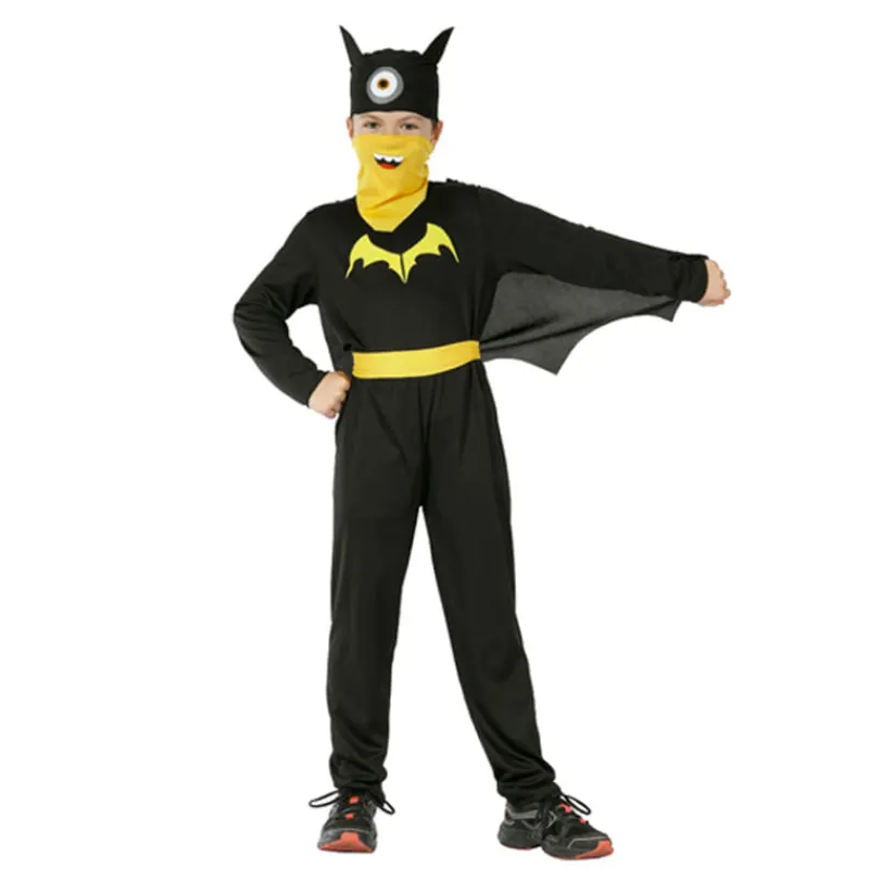 Disfraz de héroe de la noche infantil. El disfraz se compone de mono de cuerpo entero, capucha con dibujo de un ojo, capa, cinturón y pañuelo para cubrir la zona de la boca y el cuello.