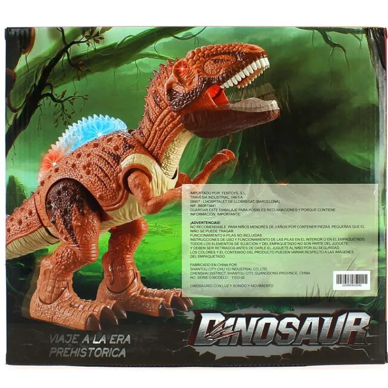 Dinosaurio con movimiento y reproducción de sonido. Al encenderlo la cabeza del dinosaurio se mueve hacia arriba y hacia abajo, abre la boca y reproduce terroríficos sonidos. Tiene efectos de luz. Al moverse, el dinosaurio accionará sus patas delanteras, las traseras y la cola. Funciona con 3 pilas AA NO incluidas. Recomendado a partir de 3 años.