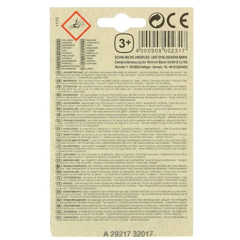 ¡Advertencias! no conveniente para niños menores de 36 meses. Piezas pequeñas. Peligro de asfixia. Utilícese bajo la vigilancia directa de un adulto. No utilizar cerca del oído. Un mal uso puede causar problemas de audición. ¡No disparar en lugares cerrados!. Utilizar sólo fulminantes recomendados por el fabricante. Este modelo cumple las normas de seguridad vigentes. Para cumplir con los niveles de sonido establecidos por la norma une-en 71-1 deberán utilizarse los fulminantes wicke euro caps. Cualquier otro modelo de fulminante puede generar un sonido superior. Gonher,s. A. No se hace responsable del comportamiento del consumidor ni de las consecuencias que de ello deriven. Conservar la dirección. Fabricado en españa.