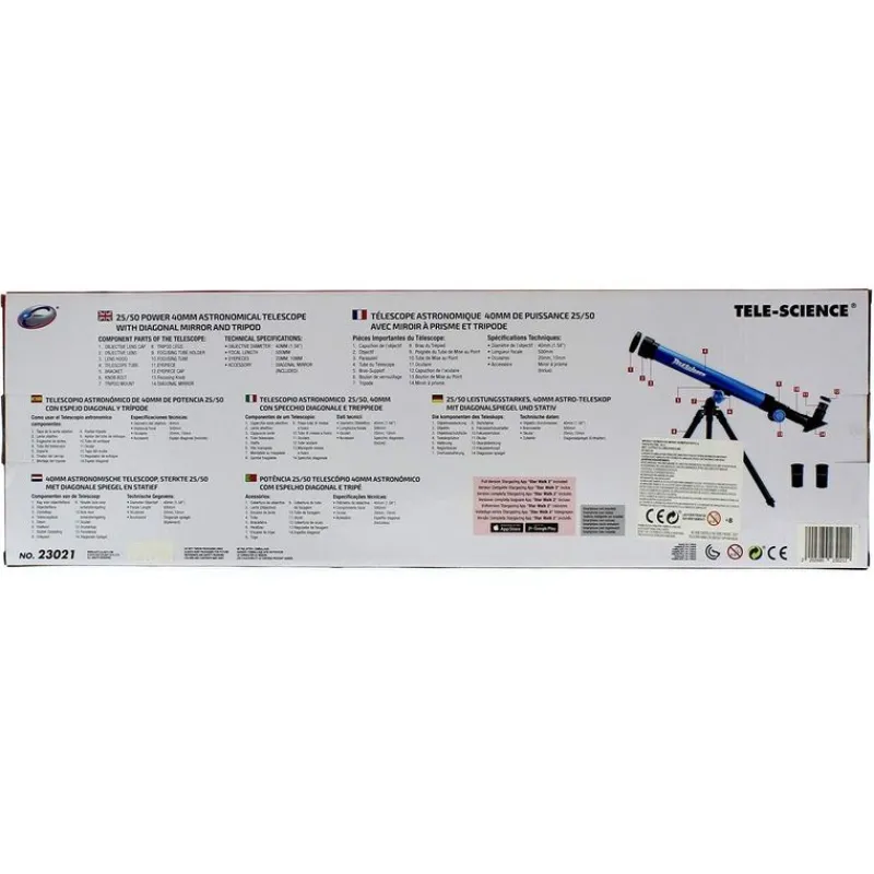 Telescopio astronómico con trípode, ideal para que los niños se adentren en el maravilloso mundo de la astronomía. Incluye 1 telescopio completo, 1 trípode, 1 espejo diagonal, 2 oculares e instrucciones de uso.