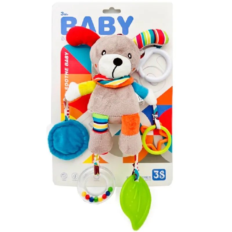 Adorable peluche de conejito acompañado de diferentes actividades para tu bebé, con mordedor sonajero y colgador para que puedas llevarlo en el carro o colgarlo en la cuna. Recomendado a partir de 3 meses.