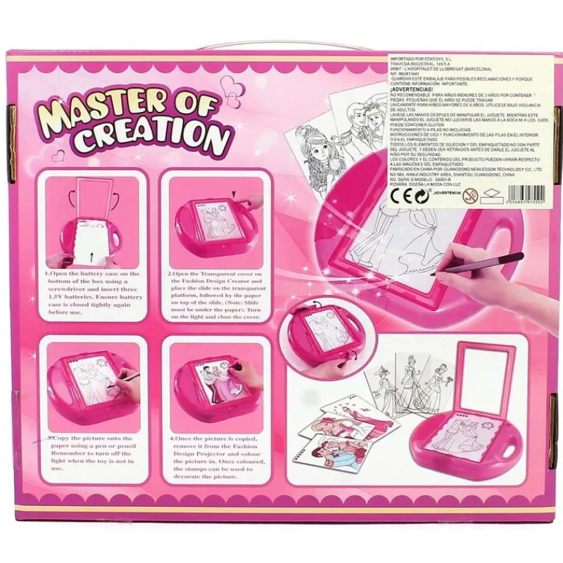 ¡Crea tu propio mundo de ensueño! Con esta pizarra con luz podrás crear tus propios diseños, desde el estilo de peinado, las caras, los cuerpos, las posturas y la ropa ¡Hay 1296 diseños diferentes! Incluye 30 discos y 10 láminas de papel. Funciona con 3 pilas AA NO incluidas. Recomendado a partir de 6 años.