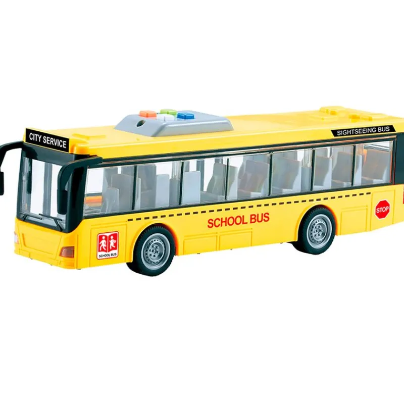 Autobús escolar con una escala de 1:16. Funciona como si fuera de verdad gracias a su sistema de carga por retroceso. Reproduce luces y sonidos. Funciona con pilas incluidas (pilas de demostración). Recomendado a partir de 3 años.