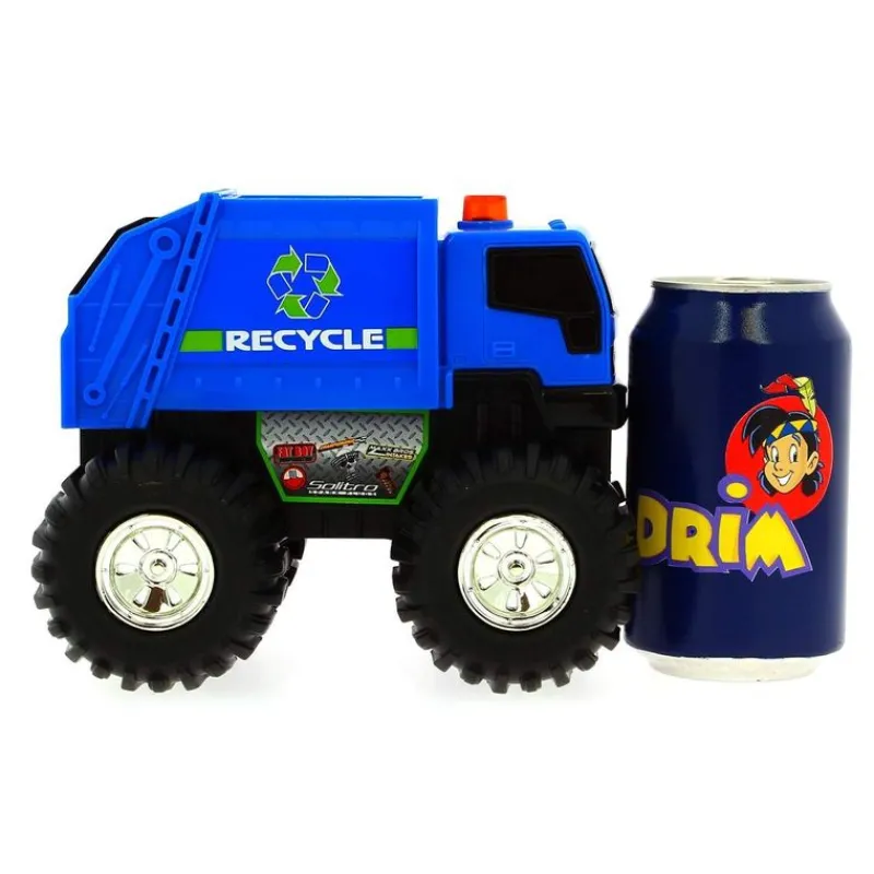 Camión de la basura infantil, de color azul. Reproduce divertidos sonidos y canciones. Tiene luz y arrancará al pulsar el botón superior. Funciona con 2 pilas AAA incluidas (pilas de demostración). Recomendado a partir de 3 años.