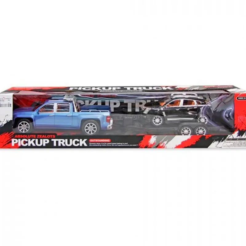 Vehículo infantil de tipo pick up con remolque y acompañado de otro vehículo.