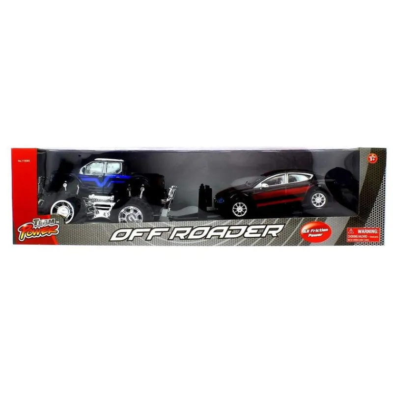 Gran monster Jeep con remolque y coche deportivo. Funciona en modo fricción. Modelo de color rojo y negro. Recomendado a partir de 3 años.