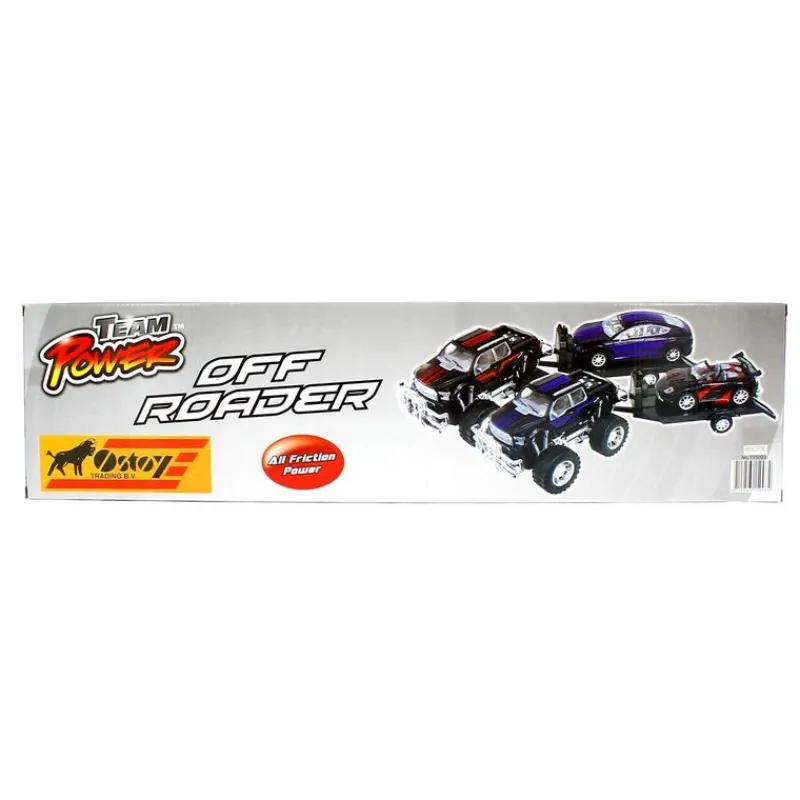 Gran monster Jeep con remolque y coche deportivo. Funciona en modo fricción. Modelo de color descapotable negro y azul. Recomendado a partir de 3 años.