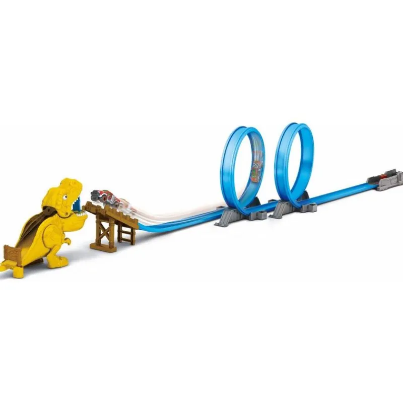 Pista de vehículos que incluye un increíble recorrido, que contiene un alucinante doble looping que tendrás que superar a toda velocidad ¿Serás capaz de derrotar al feroz dinosaurio? En el interior encontrarás un vehículo de metal. Recomendado a partir de 4 años.