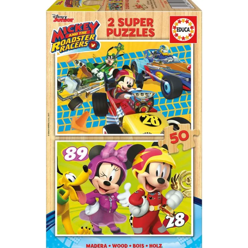 Conjunto de dos super puzzles inspirados en la serie de animación Mickey y los Superpilotos. Están fabricados en madera ecológica, que los hace más seguros para l@s más pequeñ@s. Cada puzzle contiene 50 piezas y montados tienen un tamaño de 26 cm x 18 cm aproximadamente. Recomendado a partir de 3 años.