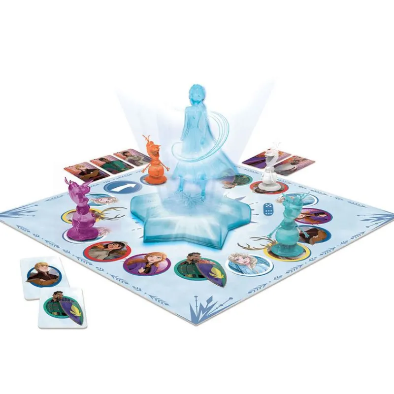 Contiene una base electrónica para la figura de Elsa, el tablero de juego, 4 piezas de juego en 3D de Olaf, 20 tarjetas de personajes, un dado y las instrucciones de juego.