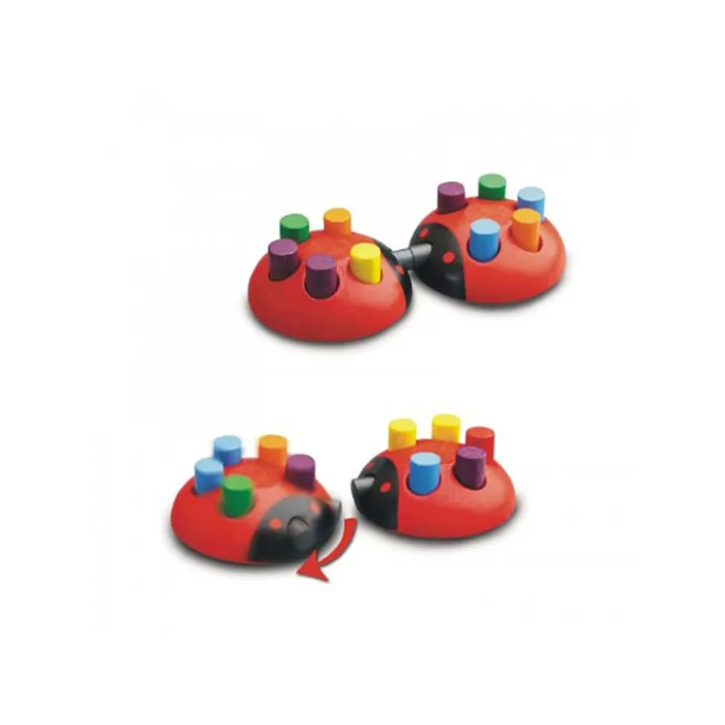 Incluye: un tablero de juego con una flecha giratoria, ocho mariquitas magnéticas, siete hormigas, cincuenta seis cilindros que representan los «puntos» de las alas de las mariquitas, en ocho colores diferentes, dos cilindros de cada color de repuesto, un tablero circular .