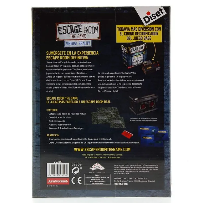 ¡Intenta acabar la aventura antes de que termine el tiempo! Juega con tus amigos a este juego, de tres a cinco jugadores, en el que ahora podrás usar la realidad virtual descargándote la aplicación con tu Smartphone. Incluye pistas físicas para que puedas combinarlas mientras juegas con la aplicación, gafas de realidad virtual y dos aventuras completas. Puedes jugar con el decodificador de Escape Room The Game o sin él. ¿Podrás escapar? ¡Tienes 60 minutos!