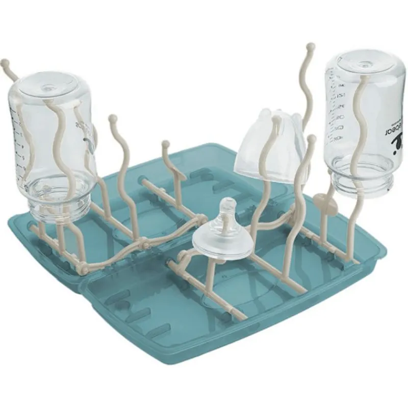Escurridor plegable ideal para llevar de viaje por su compacto tamaño, con múltiples varillas y soportes para poder poner biberones, tetinas y chupetes.