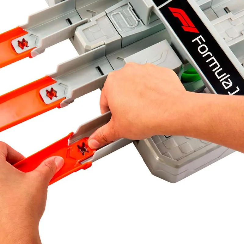 Adéntrate a toda velocidad en el mundo de las carreras de Fórmula 1® con el conjunto Circuito de Gran Premio de Formula 1® y Hot Wheels Racing.