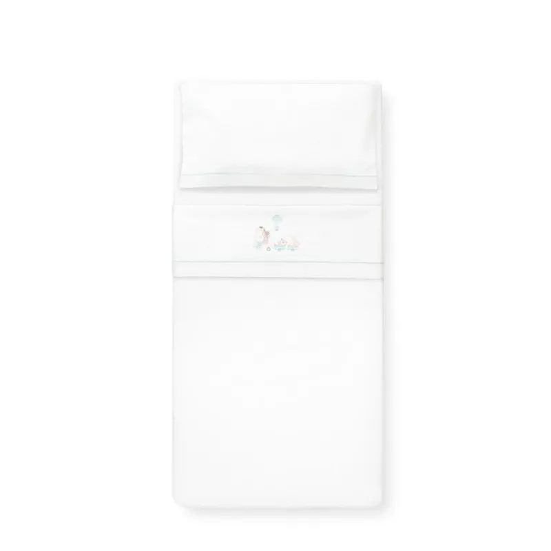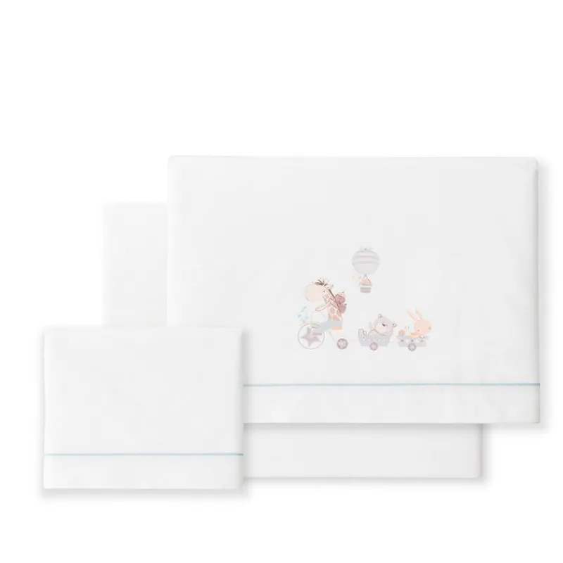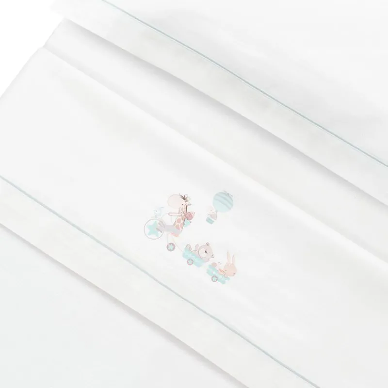 Tríptico de sábanas en algodón, con la bajera en color liso, mientras que la sábana encimera muestra el estampado de un divertido dibujo