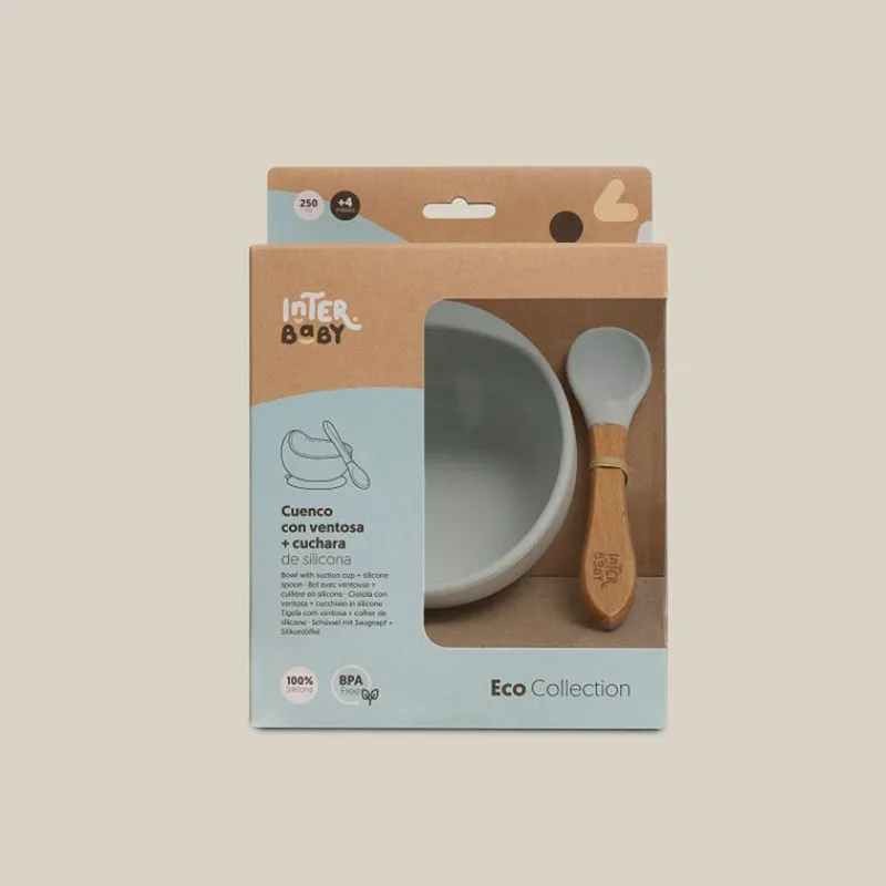 Set de bol con ventosa de silicona y cuchara para las primeras papillas de tú bebe. El cuenco lleva una ventosa en la base para fijarse firmemente en la mesa y evitar que se vuelque mientras come el peque