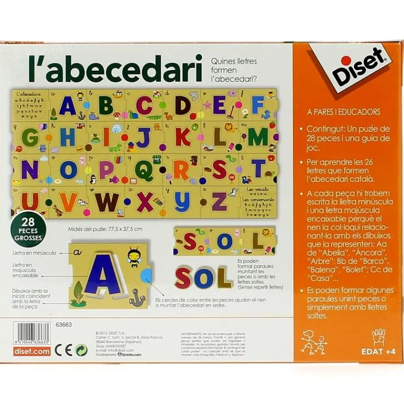 Juego educativo para aprender las letras del Abecedario en catalán. Cada letra del abecedario es una ficha, donde la silueta de la letra es una encajable para así ayudar al aprendizaje de la forma de la letra. El niño aprenderá las diferentes letras, la mayúscula, minúscula y descubrirá objetos que empiezan por esa misma letra en los dibujos que contiene. Fichas de calidad de cartón resistente.Los niños(as) aprenden las letras del abecedario, el orden y cómo es cada letra en Mayúscula y minúscula.