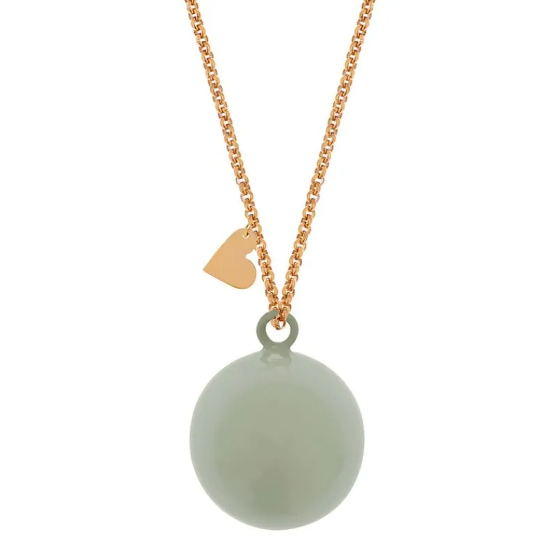 Esta cajita contiene un llamador de color menta y una cadenita con un charm en forma de corazón como colgante, ideal para regalar.