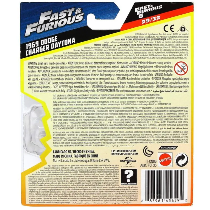 Réplica de un vehículo Dodge Charger Daytona 1969, como el que aparece en la saga de películas Fast & Furious. Está fabricado en metal y con una escala de 1:55. Recomendado a partir de 3 años.