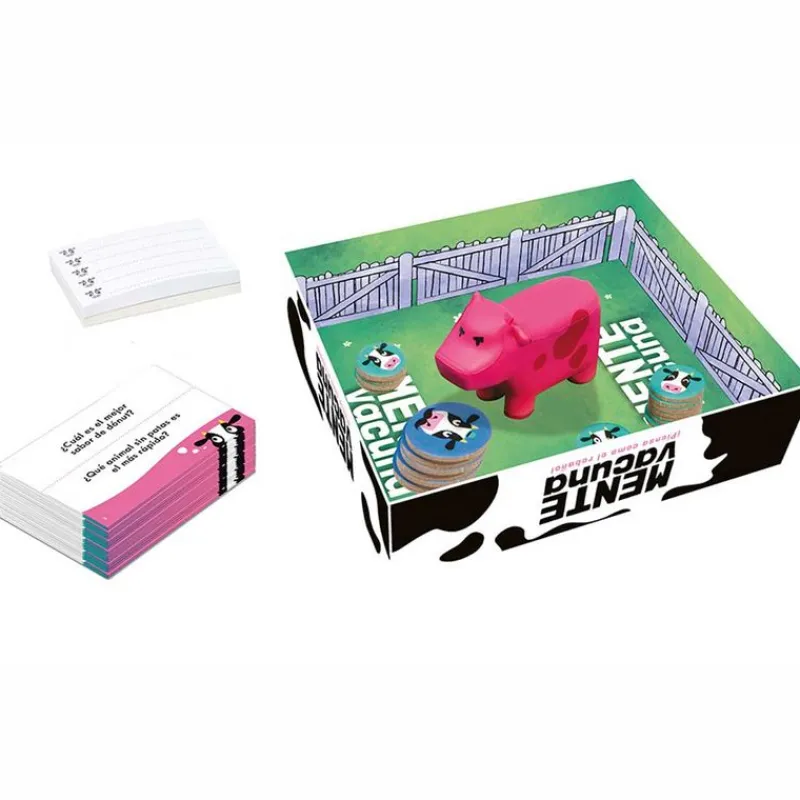 Mente Vacuna es un juego de mesa con el que tendrás que poner a prueba tu capacidad para ser parte del rebaño. El objetivo del juego es responder las preguntas que se planteen pensando en lo que responderá la mayoría. El primer jugador en conseguir 8 fichas de vacas ¡Es el ganador! De 4 a 20 jugadores. Tiempo de juego 20 minutos. Recomendado a partir de 10 años.