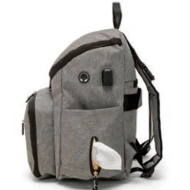 Tiene una correa en la espalda para poder fijar la mochila al mango del carro, con puerto de carga USB externo y con salida de auriculares, también cuenta en la parte trasera con un bolsillo antirrobo