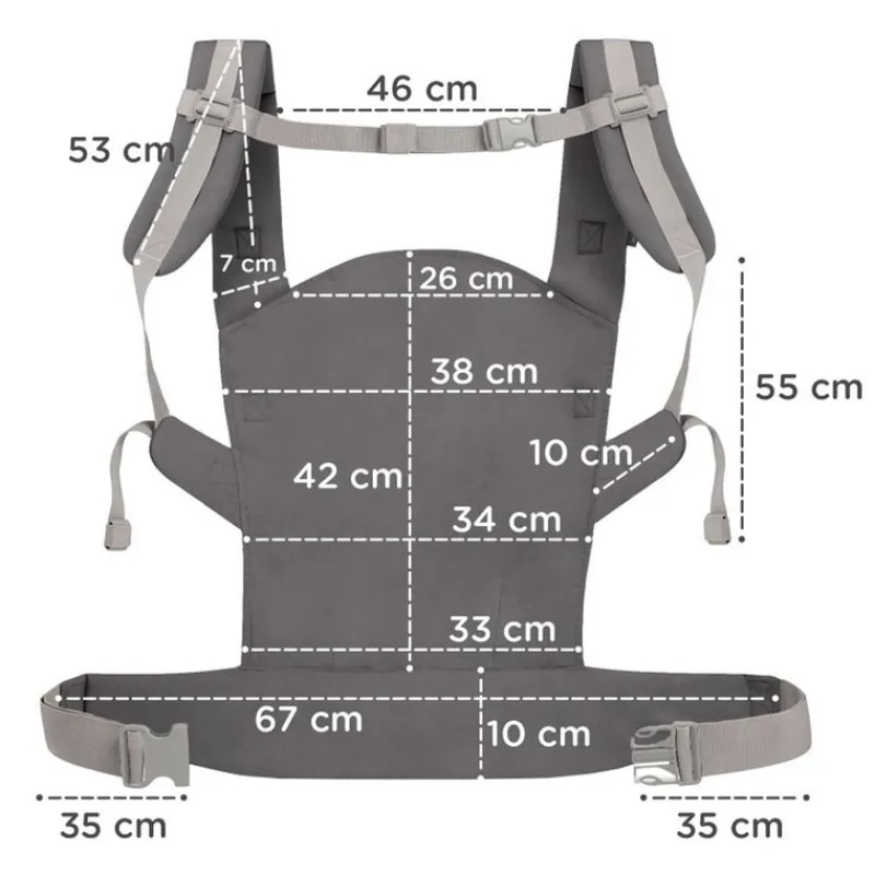 El cinturón de la cadera tiene 10cm de ancho y así alivia la tensión de los hombros e incorpora un pequeño bolsillo (20cmx9cm) donde podemos guardar el chupete, el móvil, etc…