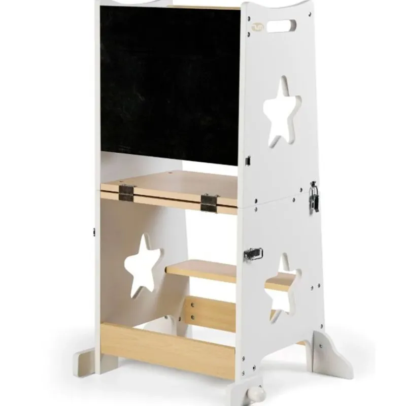 La torre 3 en 1, además de ser una torre se puede transformar en escritorio con asiento. Incluye una pizarra de tiza, ideal para que el niño pueda pintar o escribir.