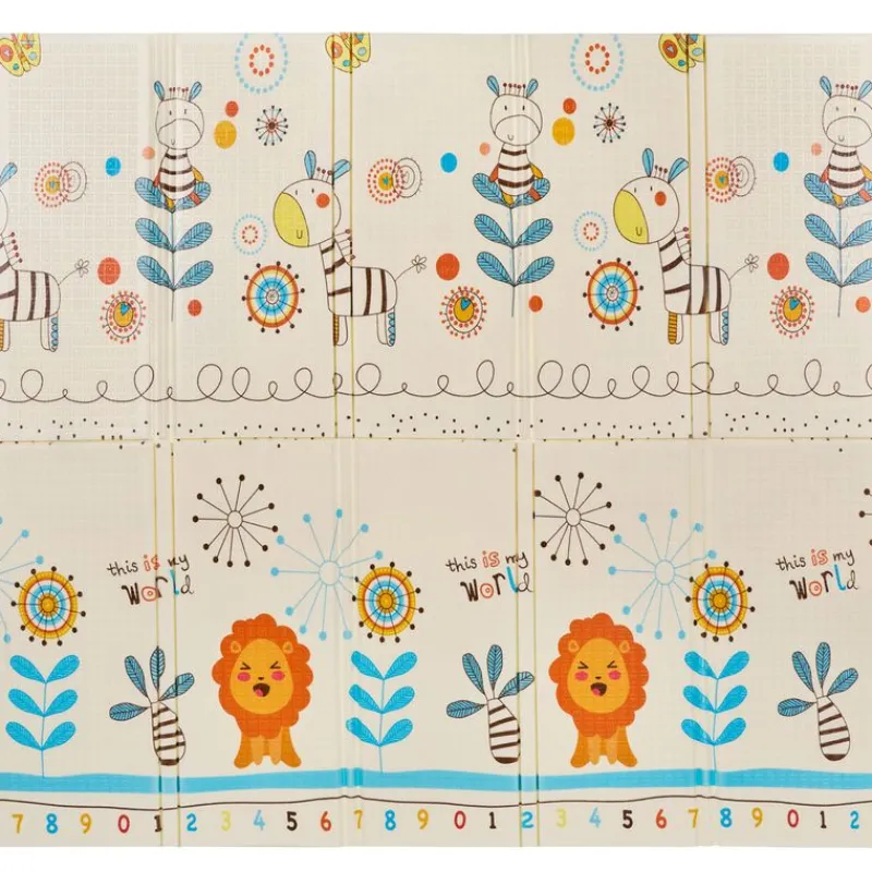 Reversible en 2 ilustraciones, en uno de los laterales tiene una ciudad dibujada con una carretera y en el otro lateral tiene divertidos y coloridos dibujos para ayudar a la estimulación visual del bebe.