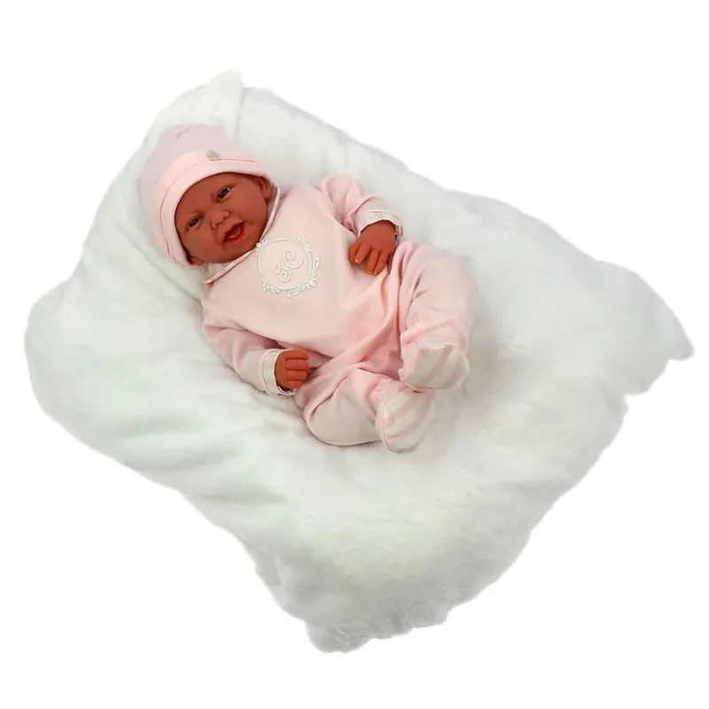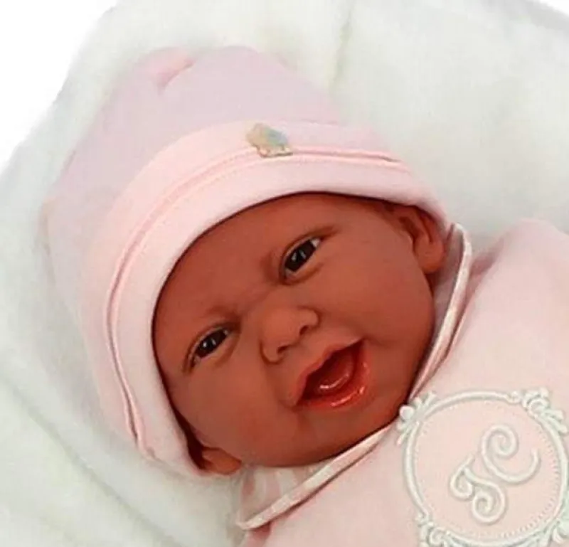 Está diseñada con todo lujo de detalles: Su piel está fabricada en vinilo suave, que imita la de los bebés de verdad, rosada e incluso con pequeñas venas visibles. Su pelo es pintado y sus pestañas son de fibra natural. Mide 40 cm de alto y pesa 1.5 kg aproximadamente.