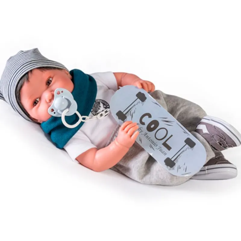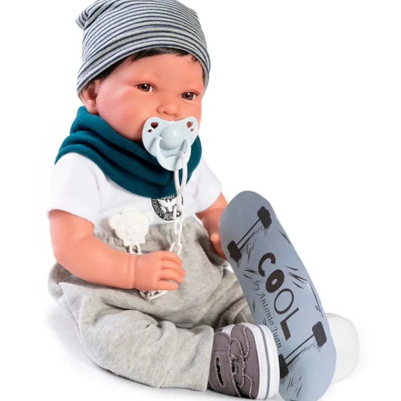 Pipo es un adorable muñeco bebé de la colección Antonio Juan. Su cuerpo está fabricado en tela blandita para que puedas abrazarlo, su cara y extremidades son de vinilo suave. Su tamaño es de 42 cm aproximadamente y pesa 800 gramos. Pipo puede ponerse en diferentes posiciones, ya que sus extremidades se pueden girar. Viene acompañado de un gorro, un cuello, camiseta, pantalones y zapatillas.