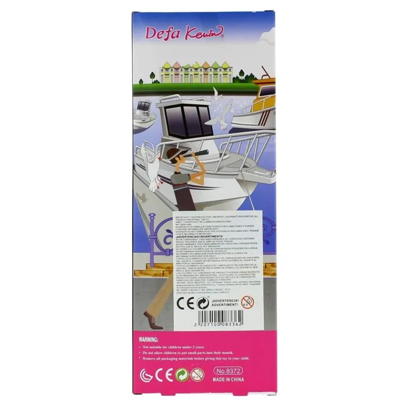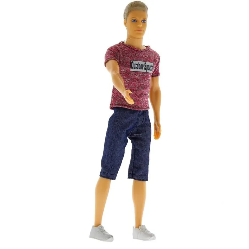 Muñeco Defa Kevin vestido con un look arreglado pero informal, con unos vaqueros por las rodillas y una camiseta con efecto de aguas en tonos rosa y fucsia. El muñeco Defa Kevin lleva un llamativo tupé, es articulado y mide, aproximadamente, 30 cm.