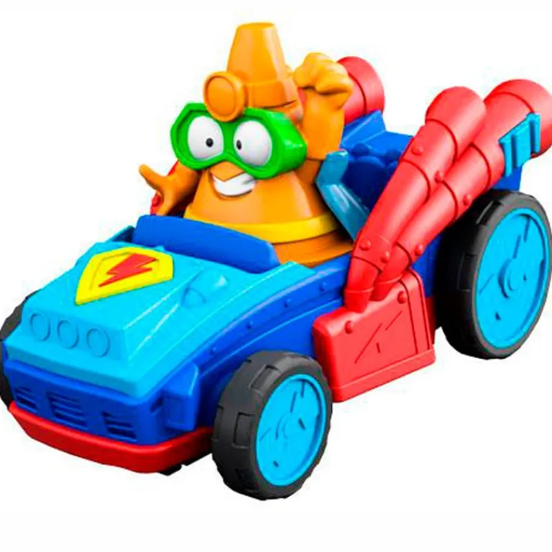 Circuito Ninco inspirado en la colección de superhéroes de Kaboom City, Superthings. Su recorrido es de 240 cm aproximadamente. En el interior encontrarás los vehículos SPEED JUMPER con los personajes de Barry Blocker y Kone San, de escala 1:50. También contiene mandos. Funciona con 8 pilas AA NO incluidas. Recomendado a partir de 3 años.