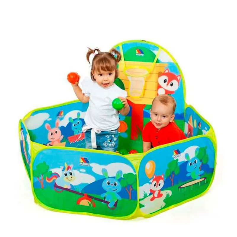 Divertido parque infantil con 25 bolas y canasta, ideal para interior y exterior, incluye bolsa para su transporte. Recomendado a partir de 1 año.